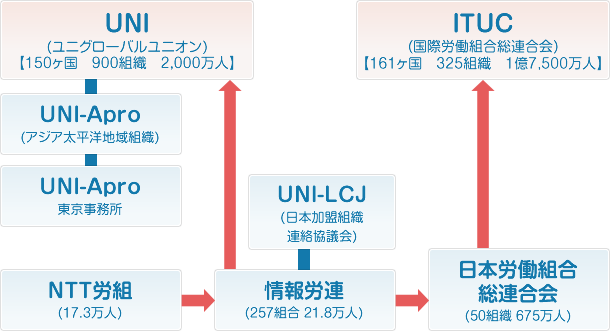 NTT労組は、情報労連を通じ、UNI組織に加盟しており、世界レベル、アジア太平洋レベルの各段階で主要なポストを担い、国際労働運動の一翼を担っています。
